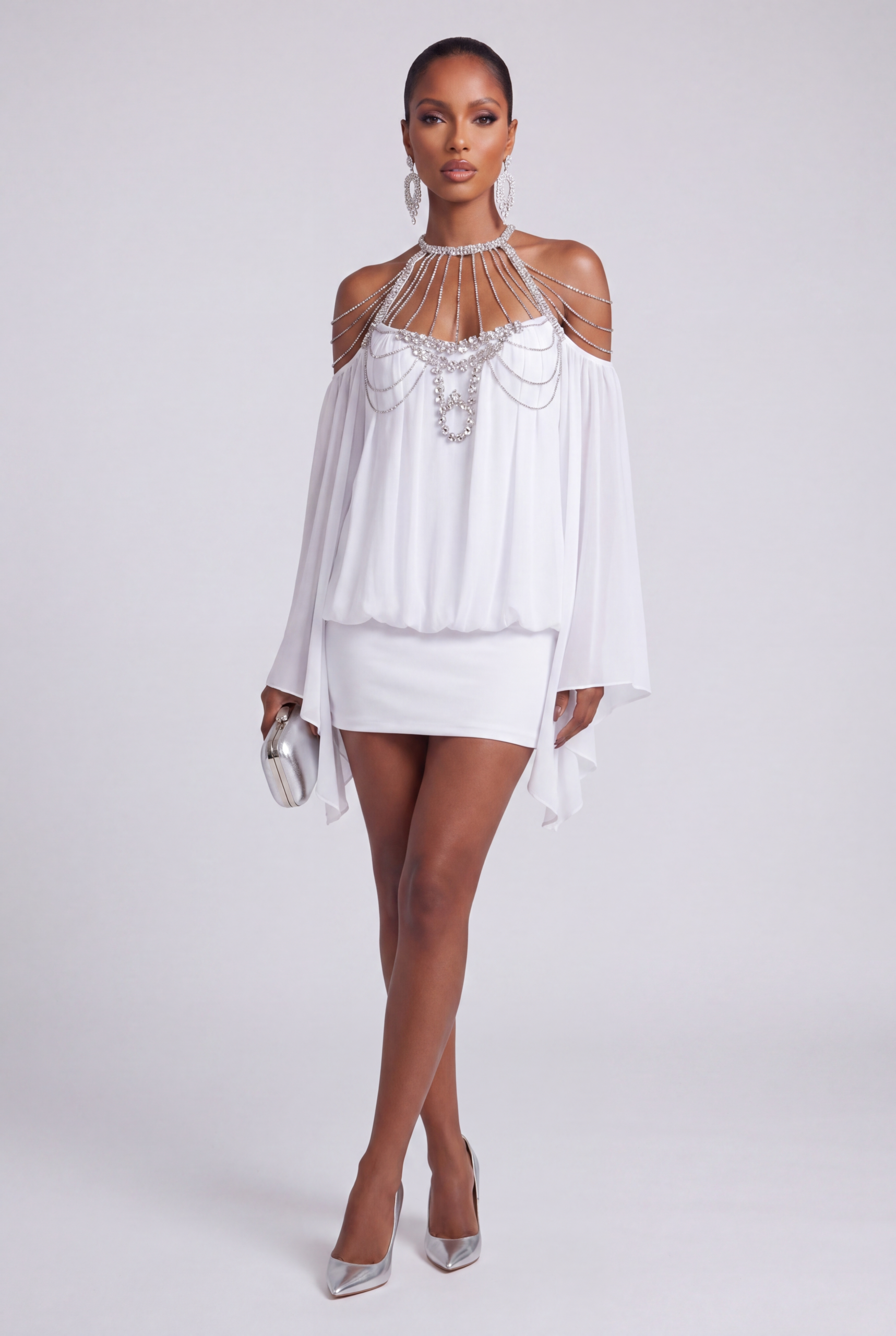 CELESTE CRYSTAL DRAPE HARNESS CHIFFON MINI DRESS – WHITE