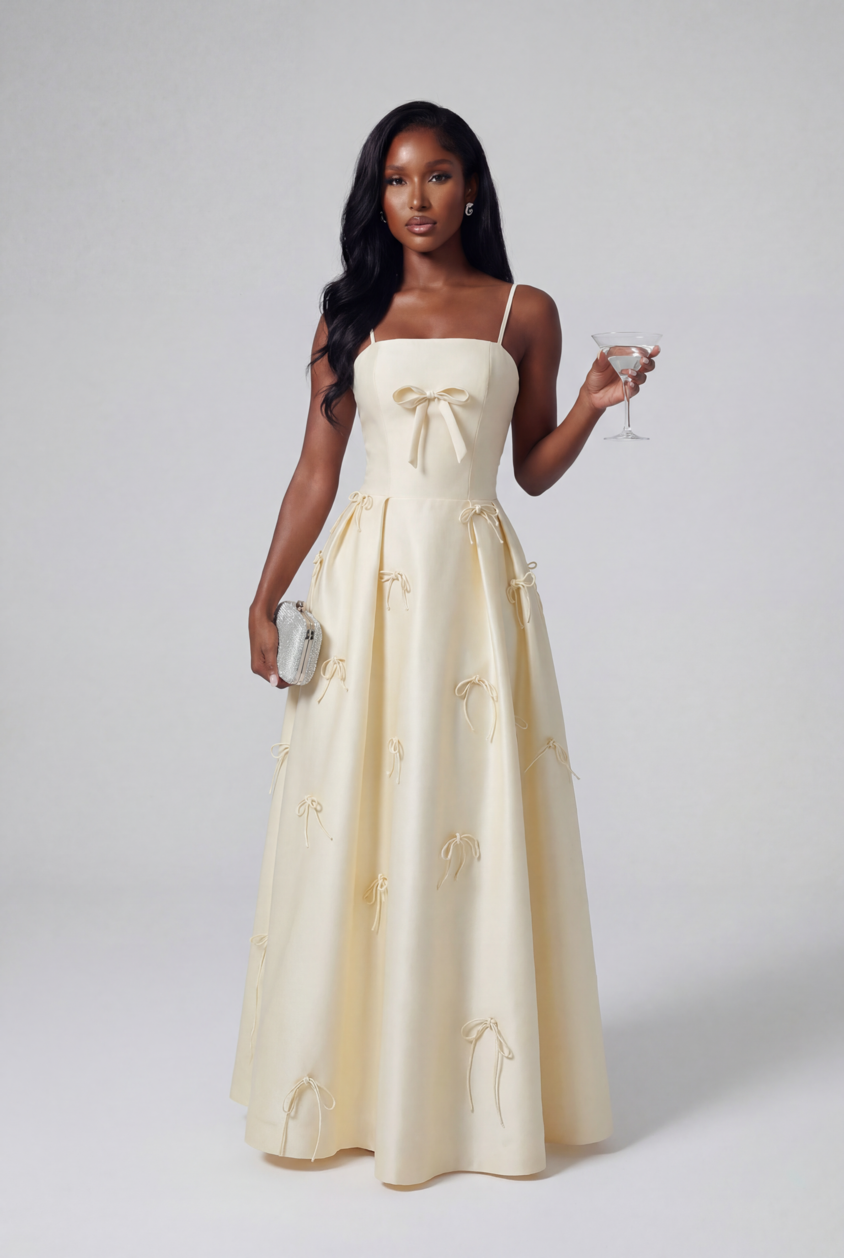 Genevieve photographs like a fairytale—the satin catches light beautifully, the bow details add visual interest, and the silhouette flatters every body type. Pair with delicate jewelry and let the dress be the star, or go bold with statement earrings for extra glamour.