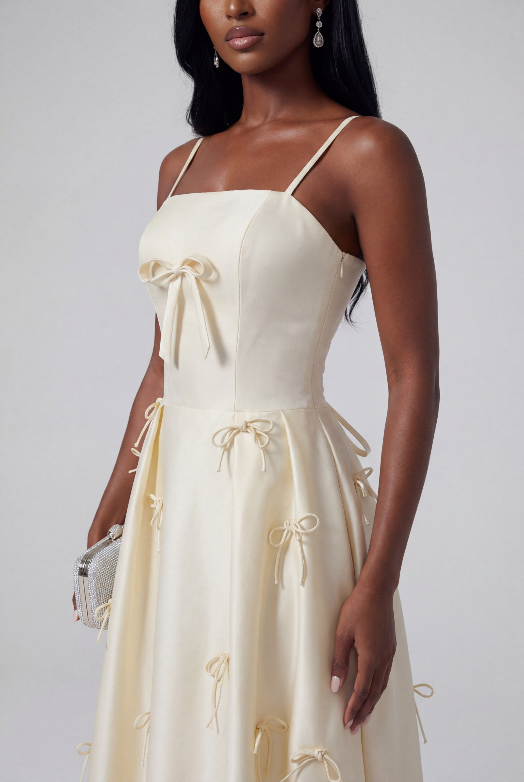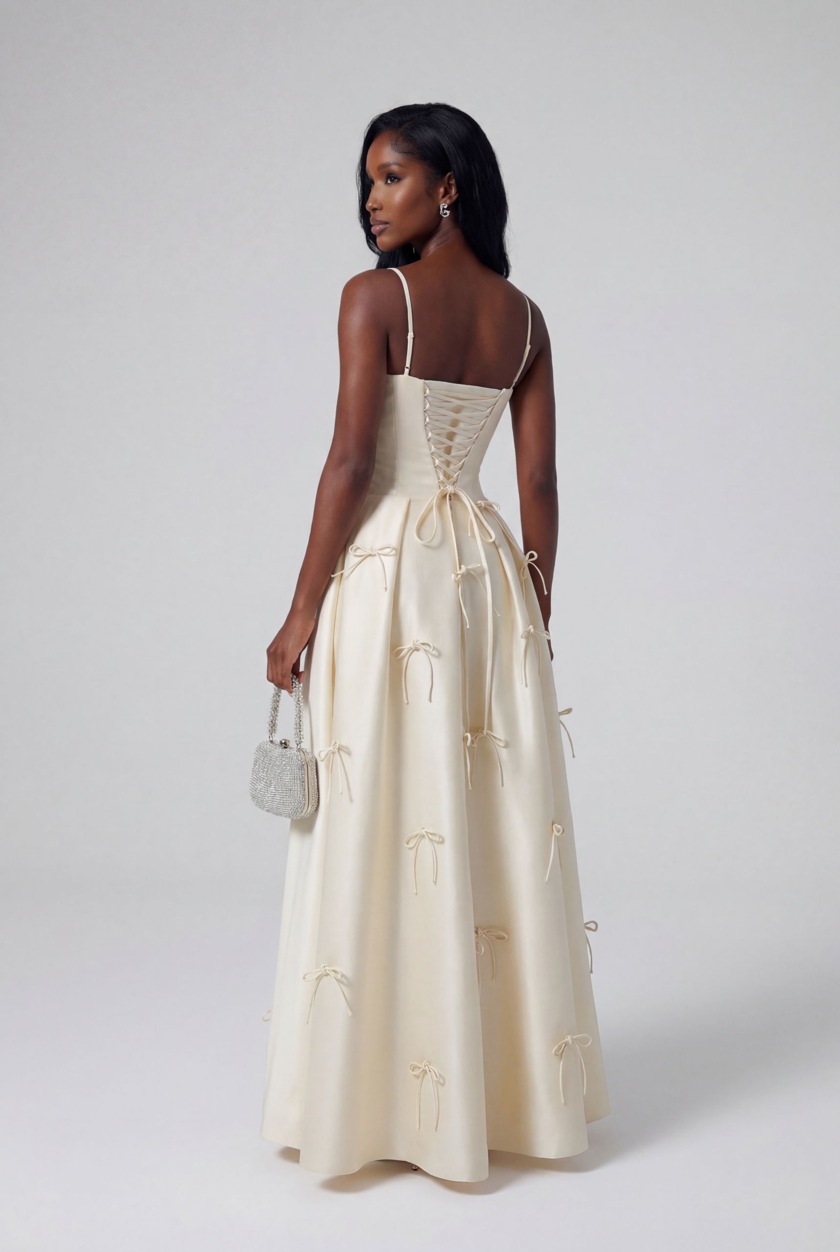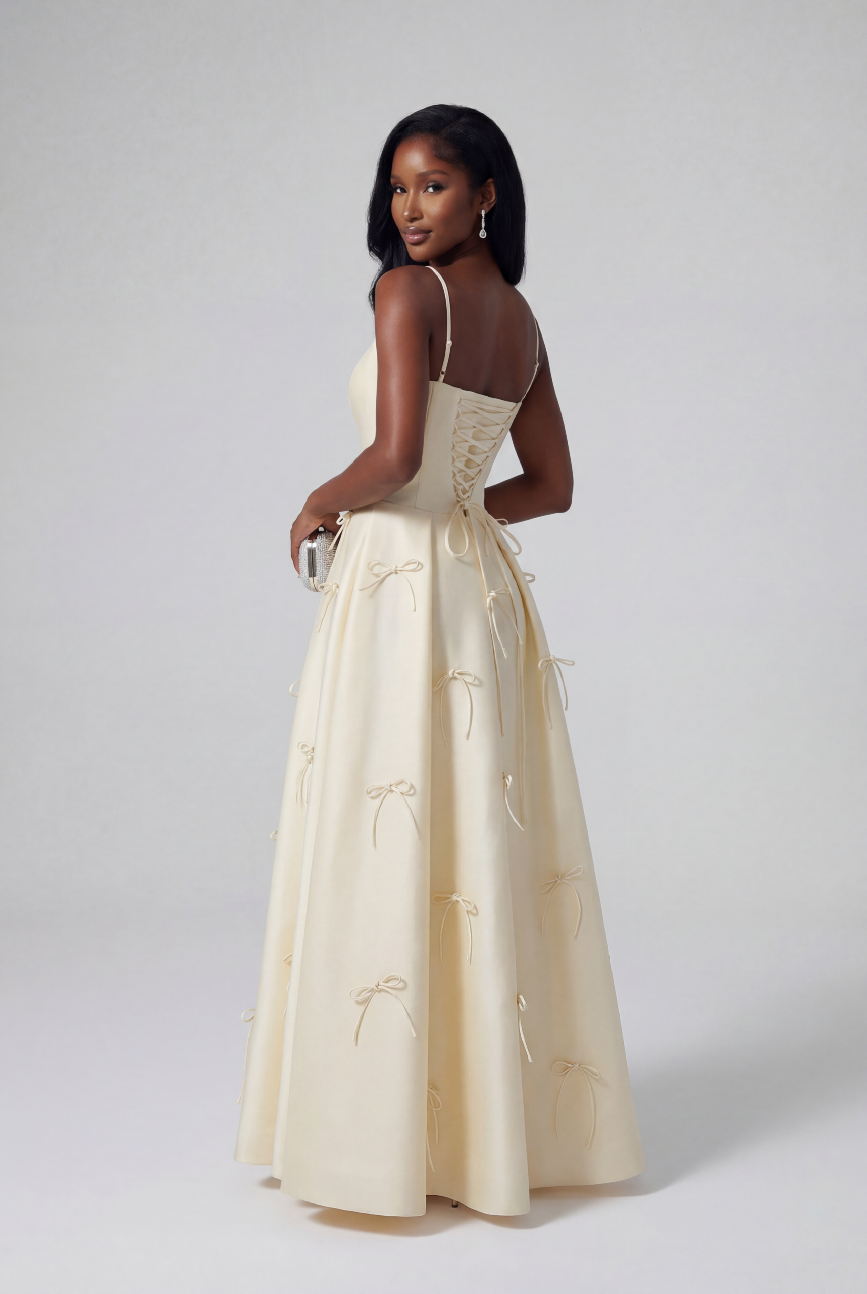 The magic is in the details—delicate satin bow embellishments cascade down the bodice and throughout the skirt, creating dimension and whimsy. A romantic corset-style lace-up back adds both vintage charm and a customizable fit, while thin spaghetti straps keep the silhouette effortlessly elegant. The structured bodice hugs your curves perfectly before releasing into a floor-length skirt that photographs beautifully from every angle.