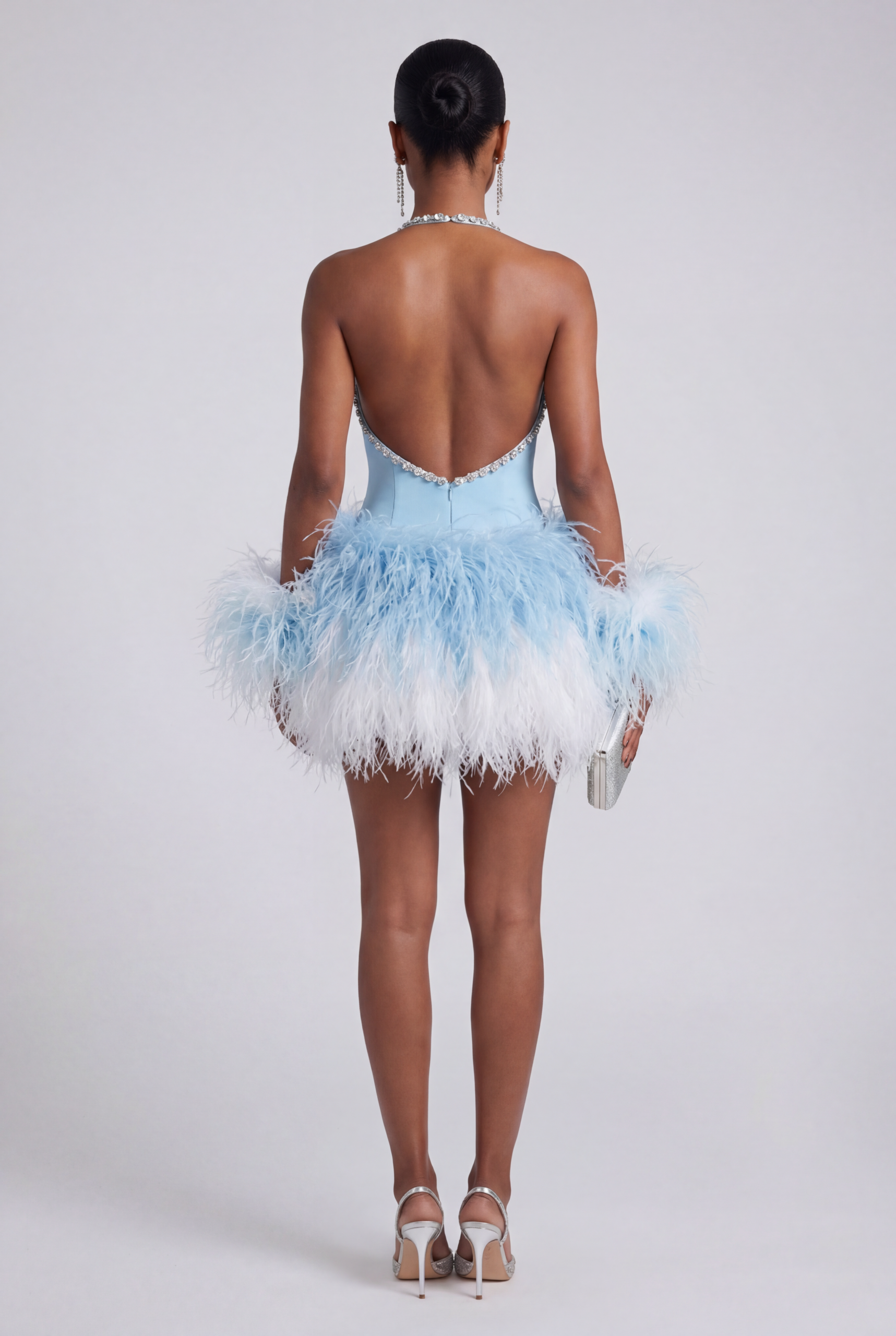 LISA CRYSTAL HALTER OSTRICH FEATHER DRESS – AZURA SKY BLUE