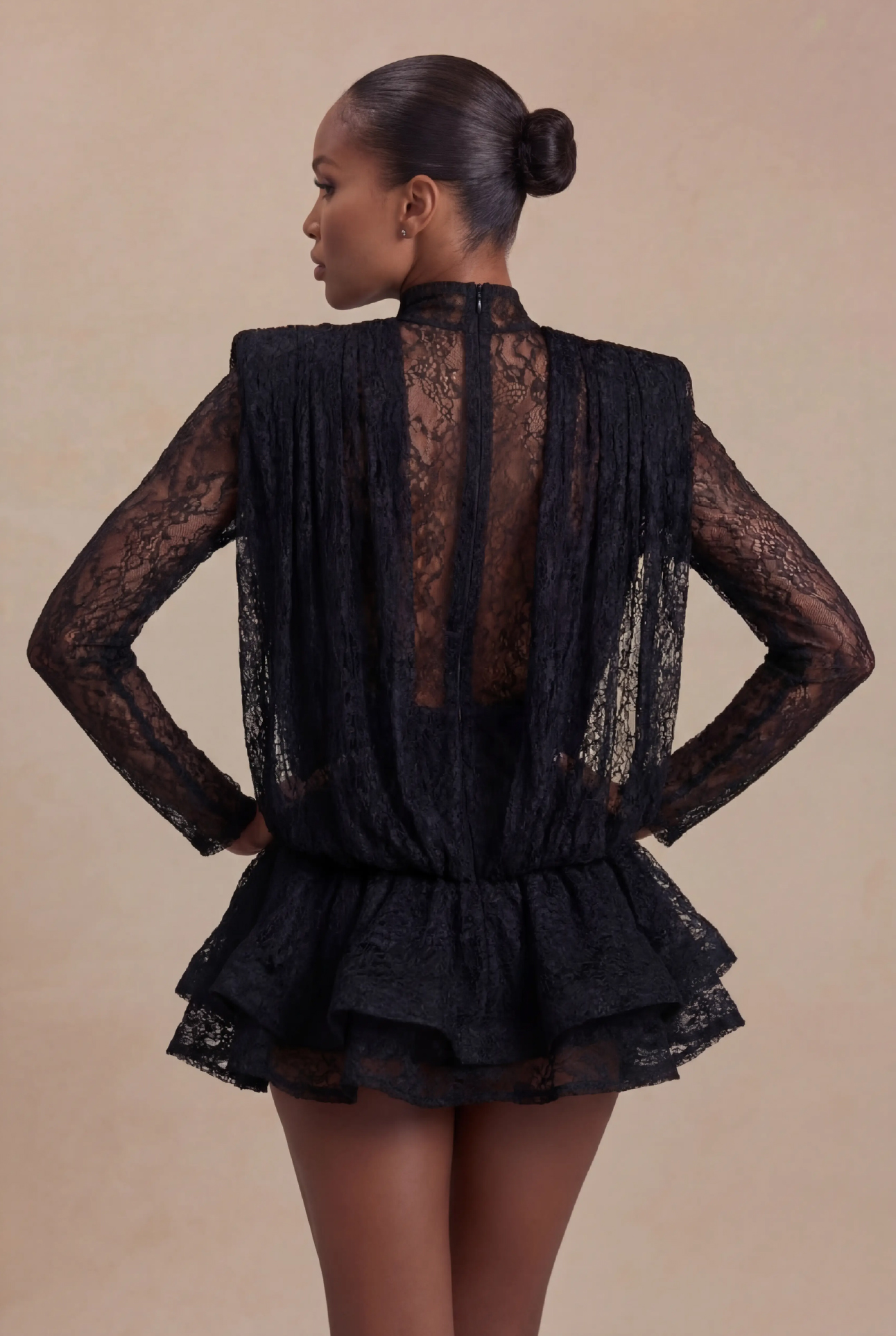 The Rania mini is crafted from soft, delicate stretch lace that drapes beautifully across the body while revealing just the right amount of skin. Its plunging, gathered neckline creates a fluid, waterfall effect—romantic, feminine, and undeniably alluring. Long sheer sleeves add balance and sophistication, letting the intricate lace detailing take center stage.