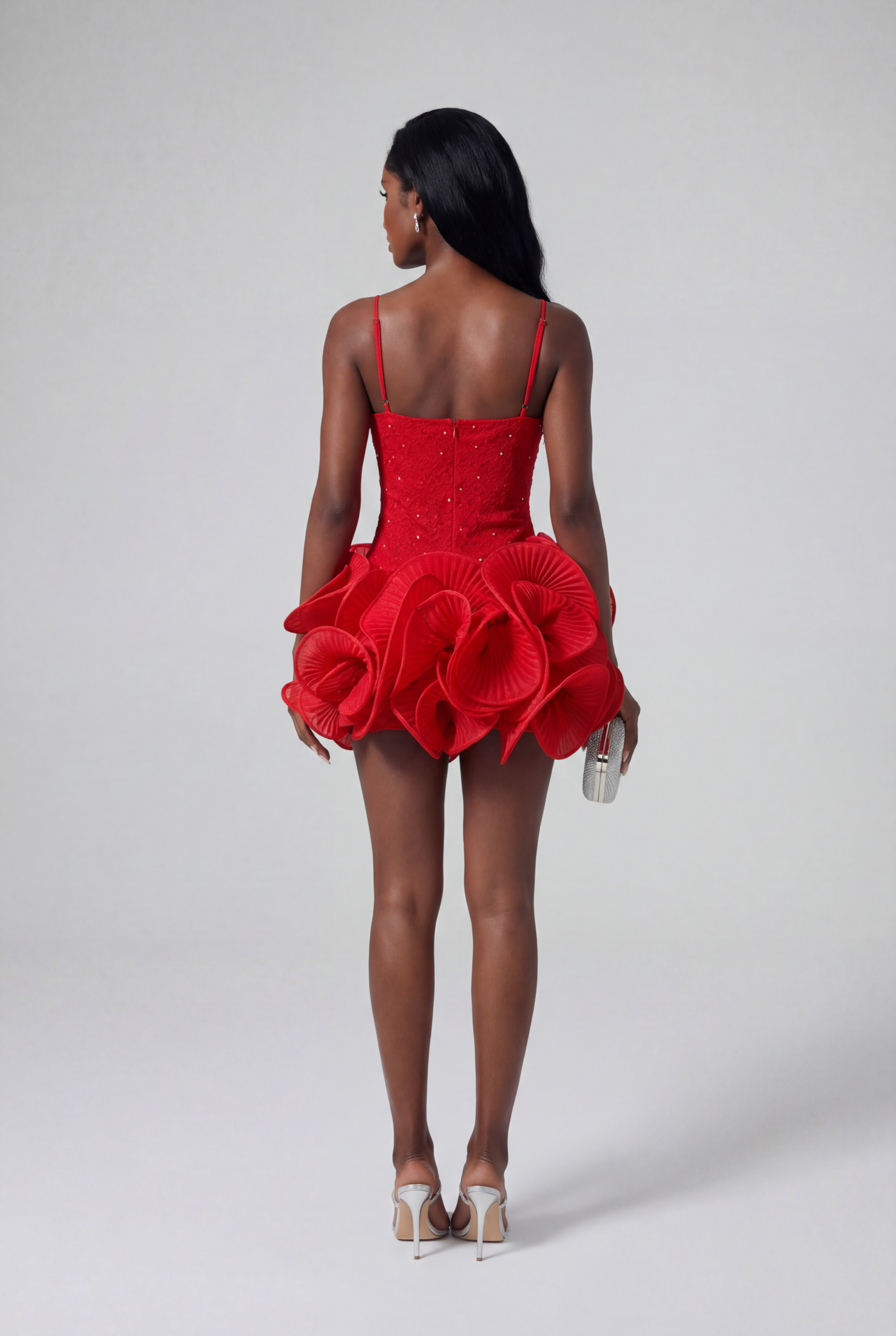 Valentina is a masterpiece of modern romance—where delicate craftsmanship meets show-stopping drama. This sculptural mini dress features a crystal-embellished fitted bodice that hugs your curves before blooming into an unforgettable rosette petal skirt that moves with you like art in motion.